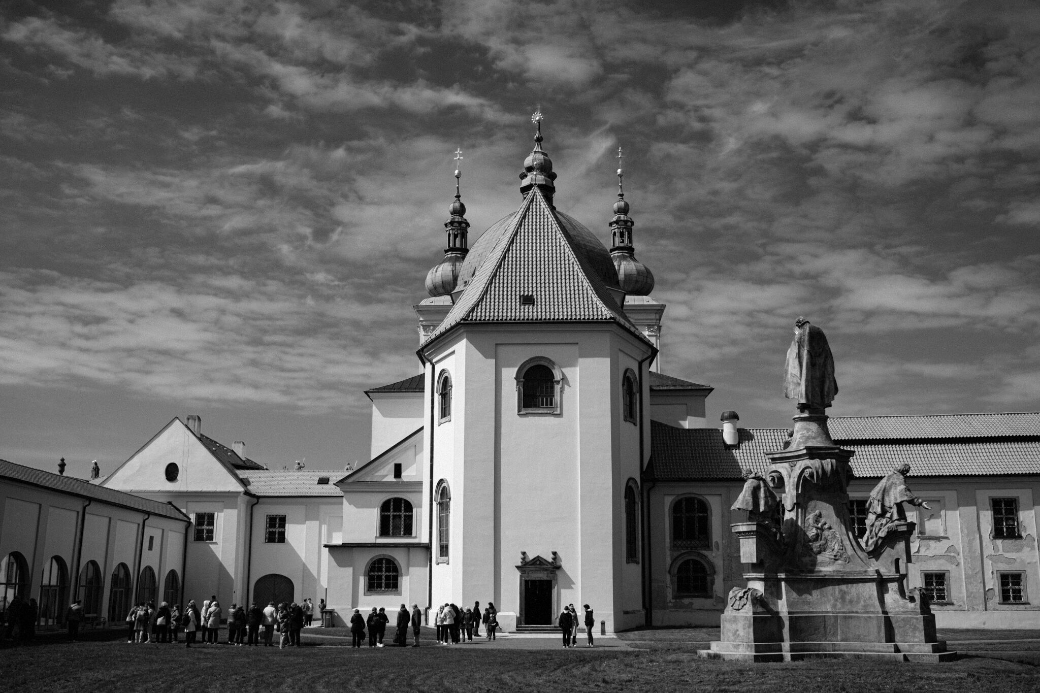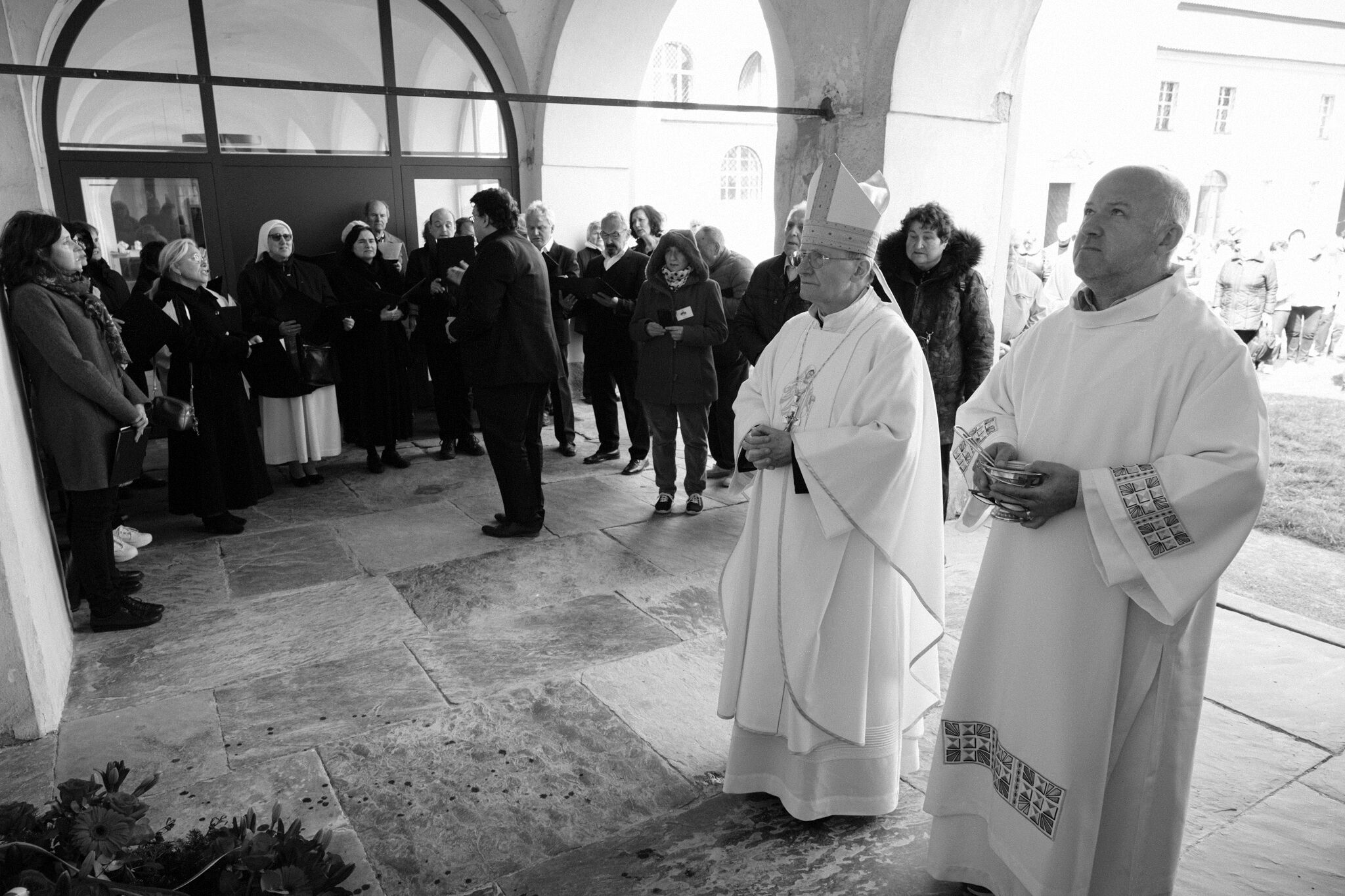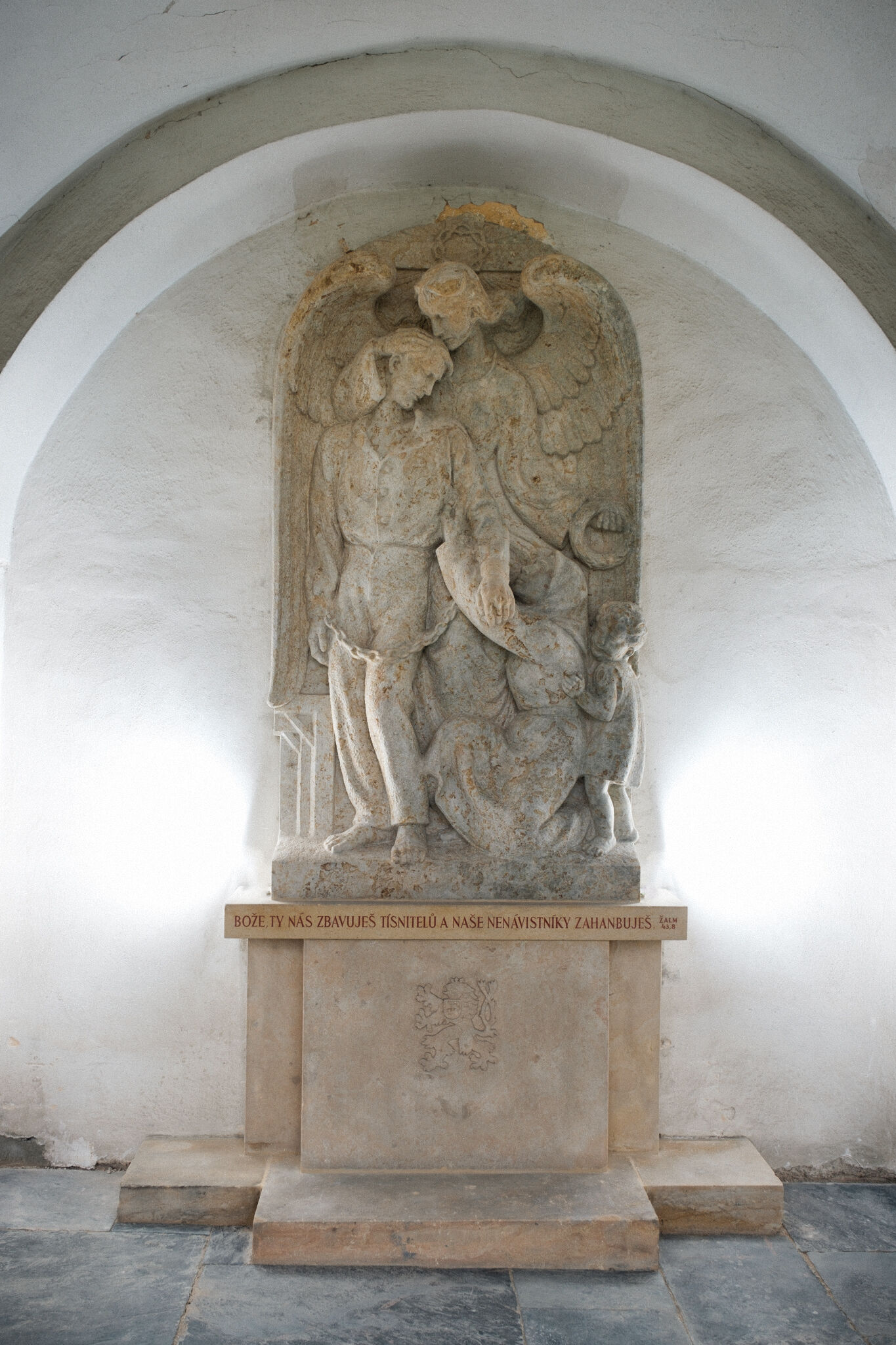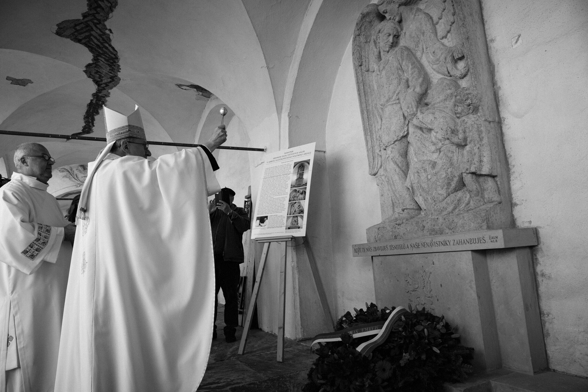 Žehnání obnoveného památníku hrdinům válek v ambitu baziliky na Sv. Kopečku. Památník je dílem sochaře Julia Pelikána.