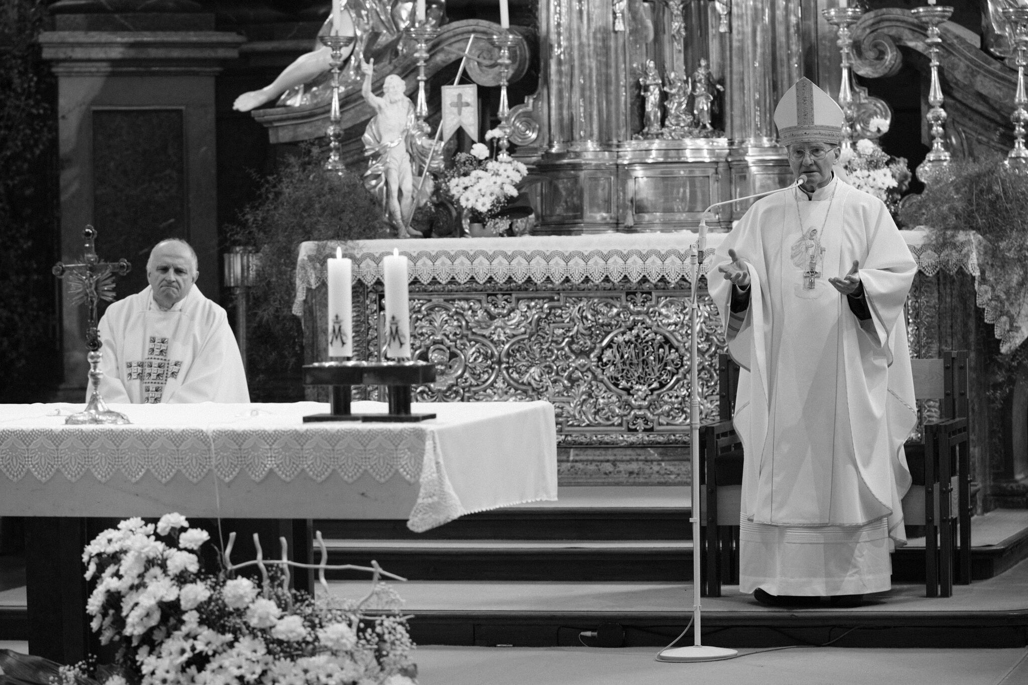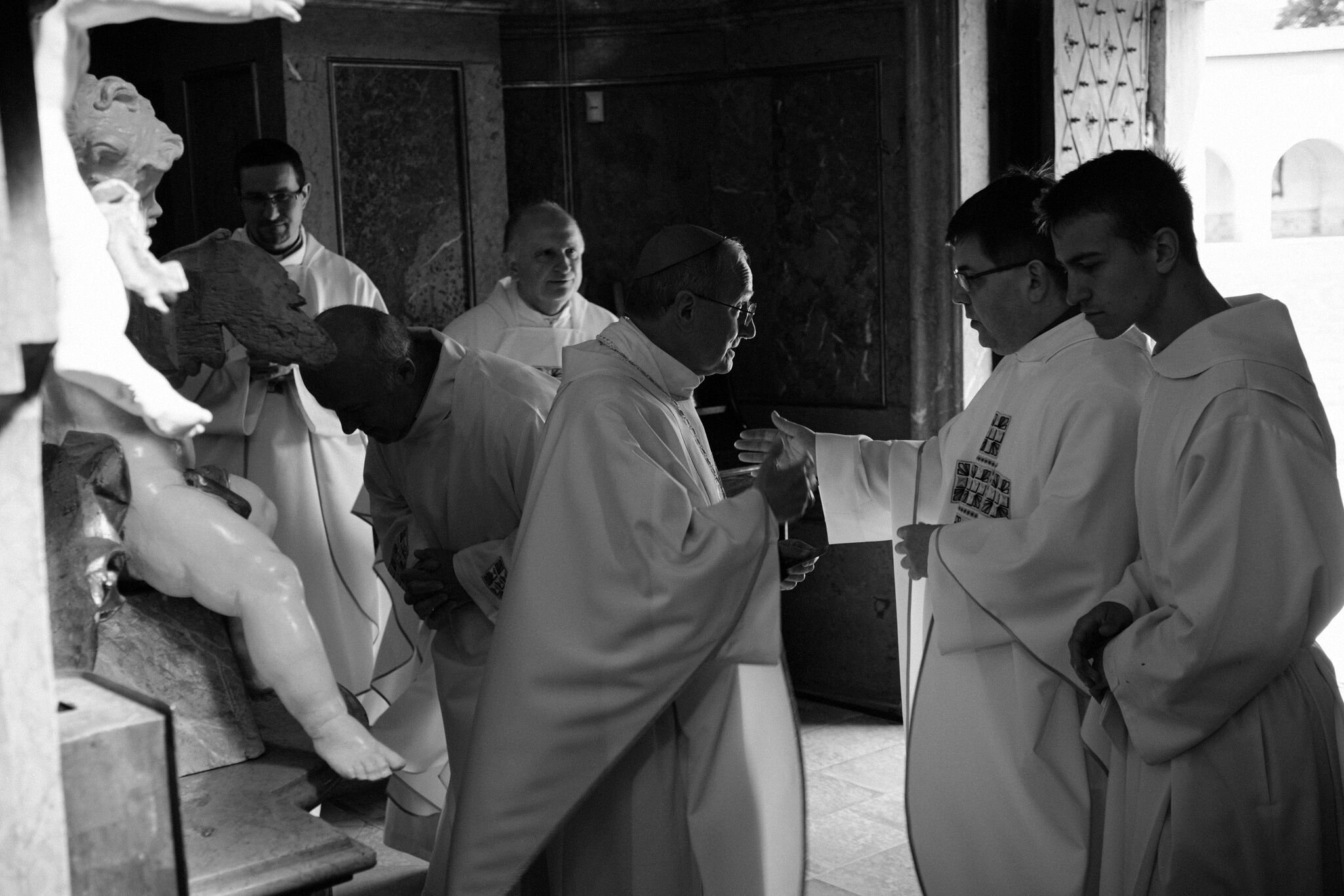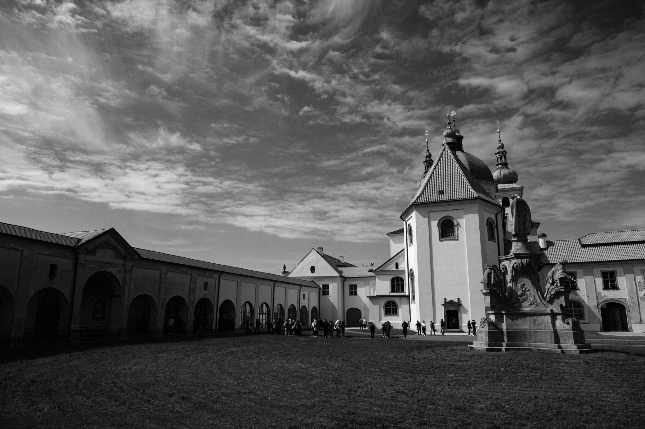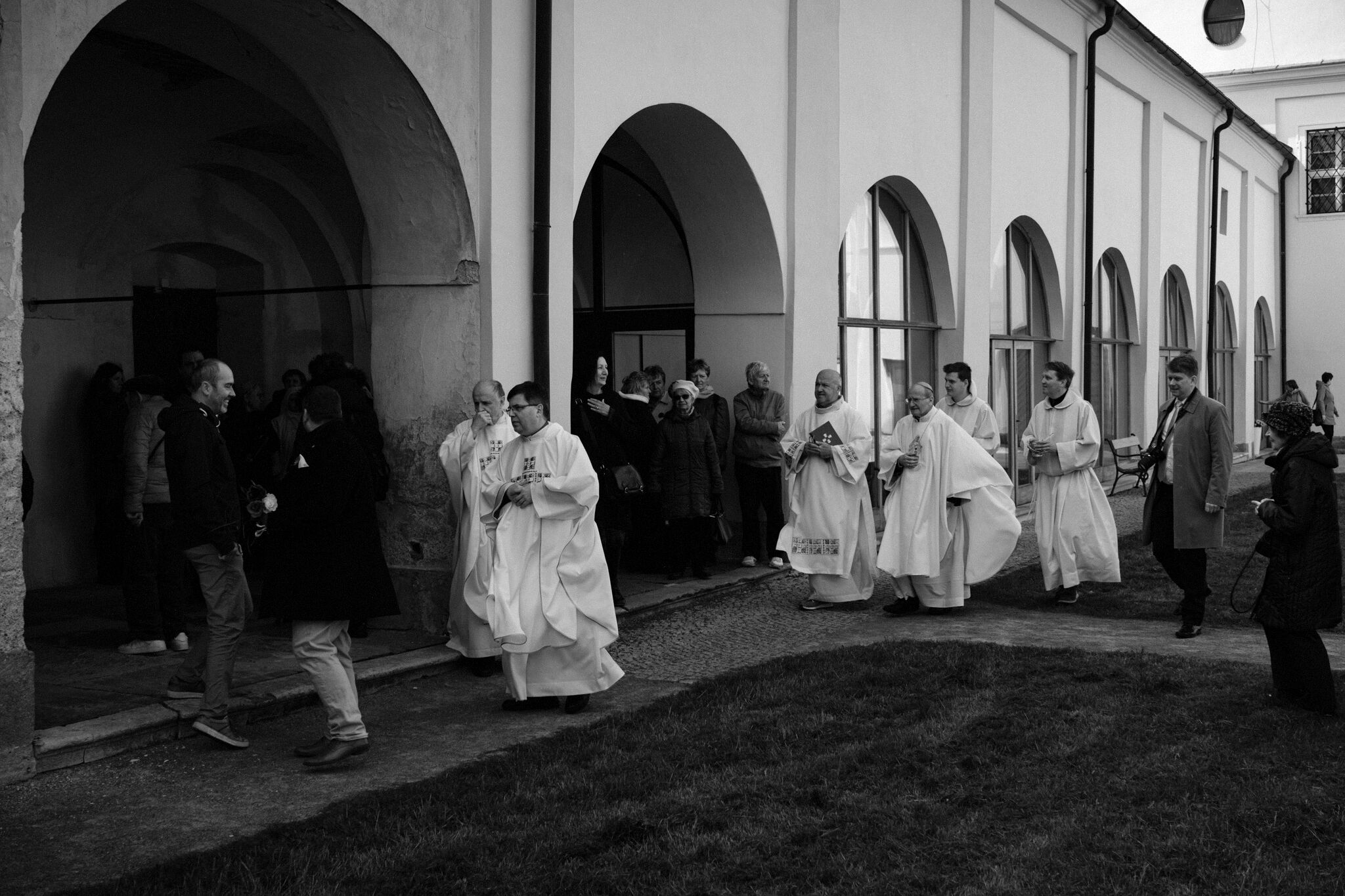Žehnání obnoveného památníku hrdinům válek v ambitu baziliky na Sv. Kopečku. Památník je dílem sochaře Julia Pelikána.
