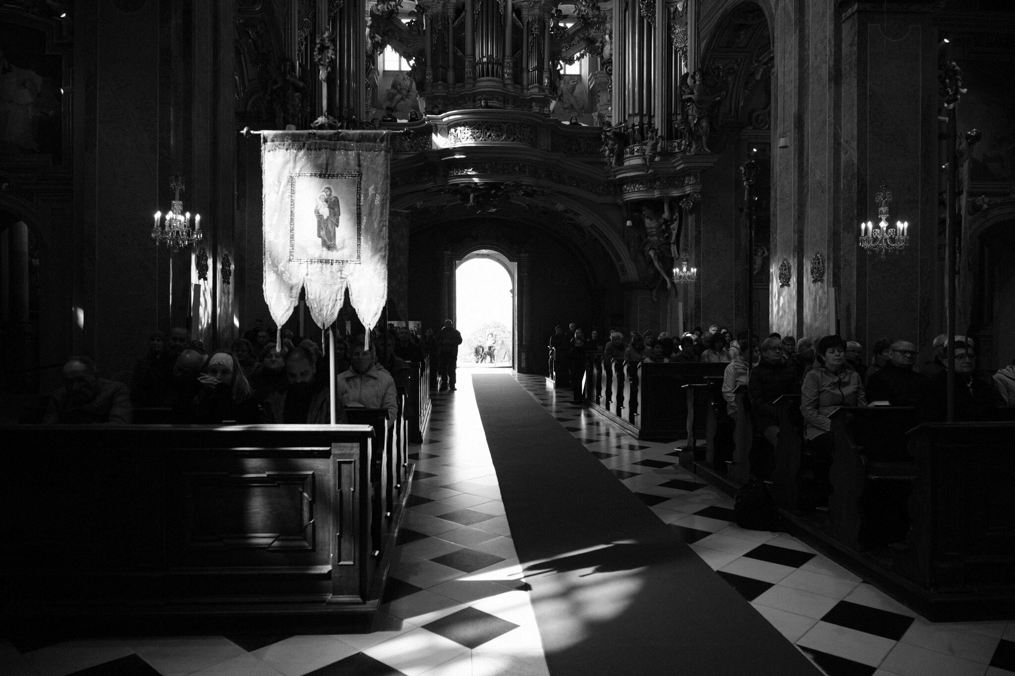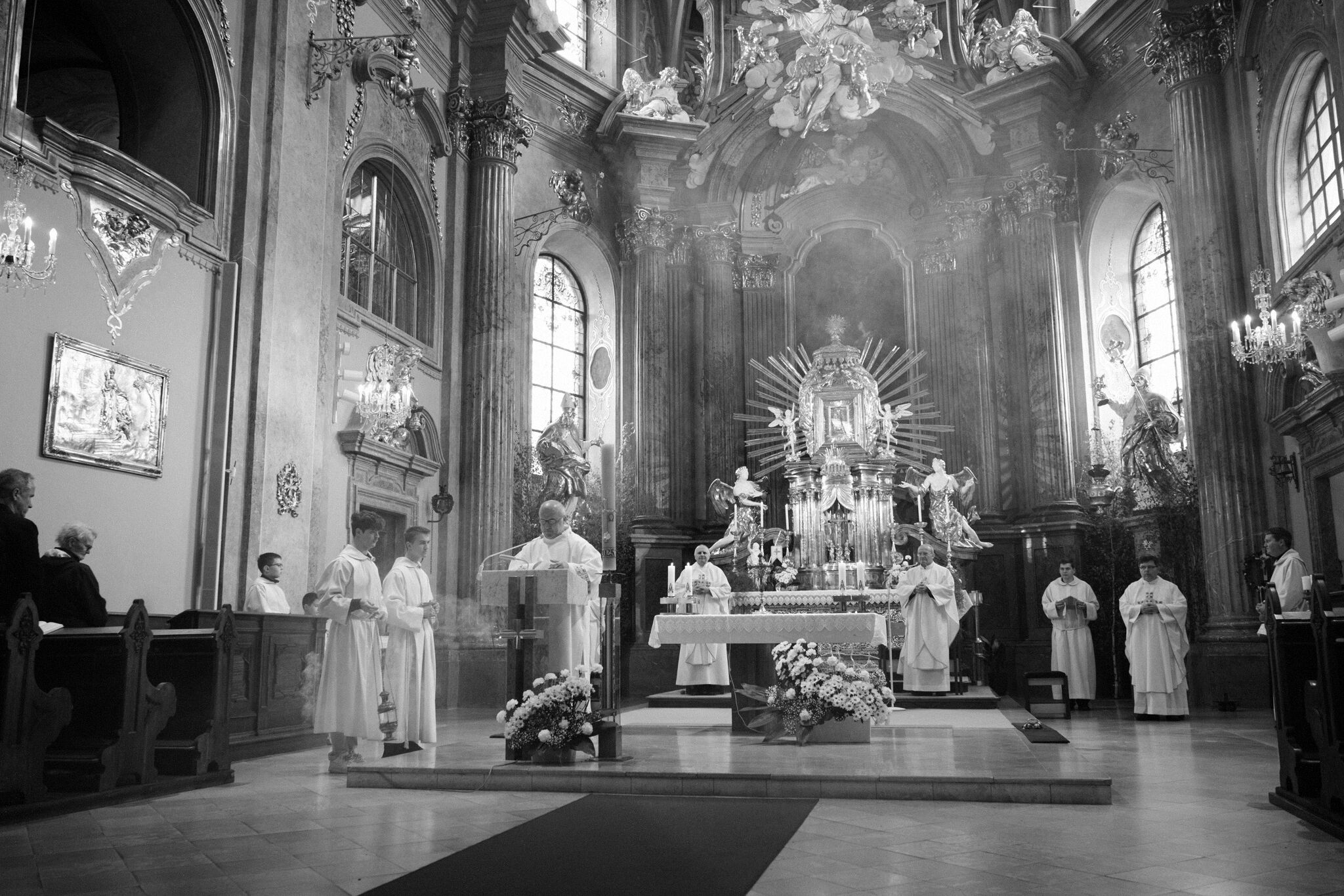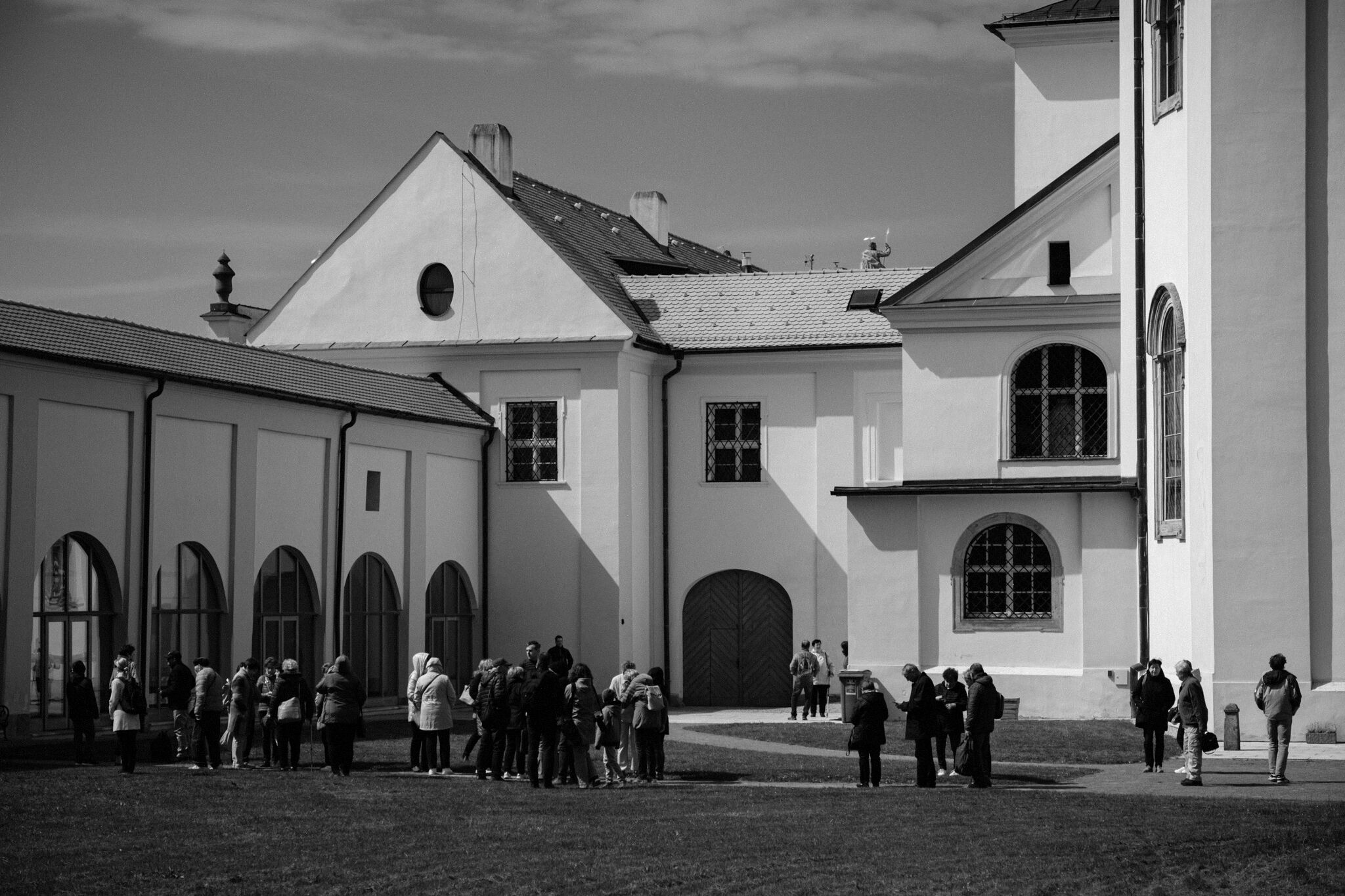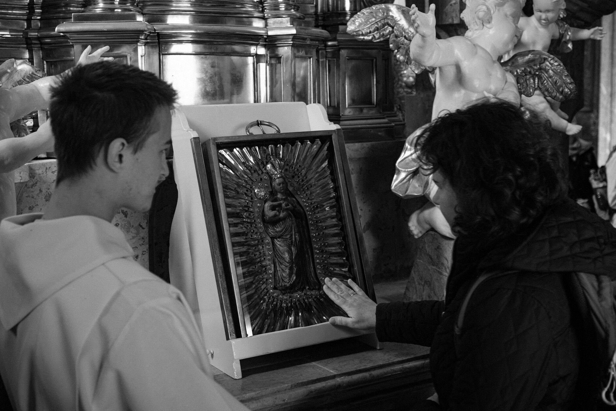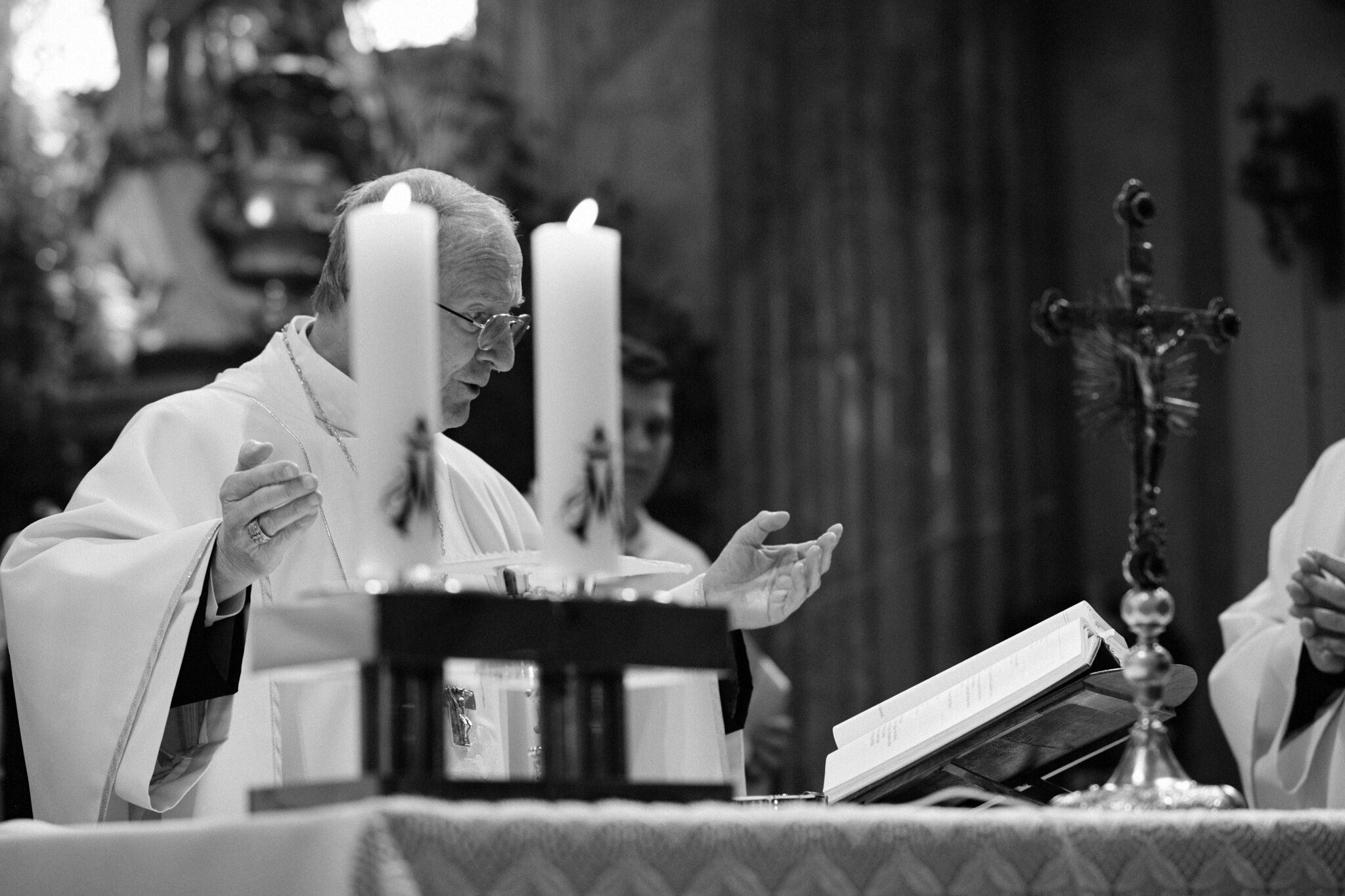 Žehnání obnoveného památníku hrdinům válek v ambitu baziliky na Sv. Kopečku. Památník je dílem sochaře Julia Pelikána.