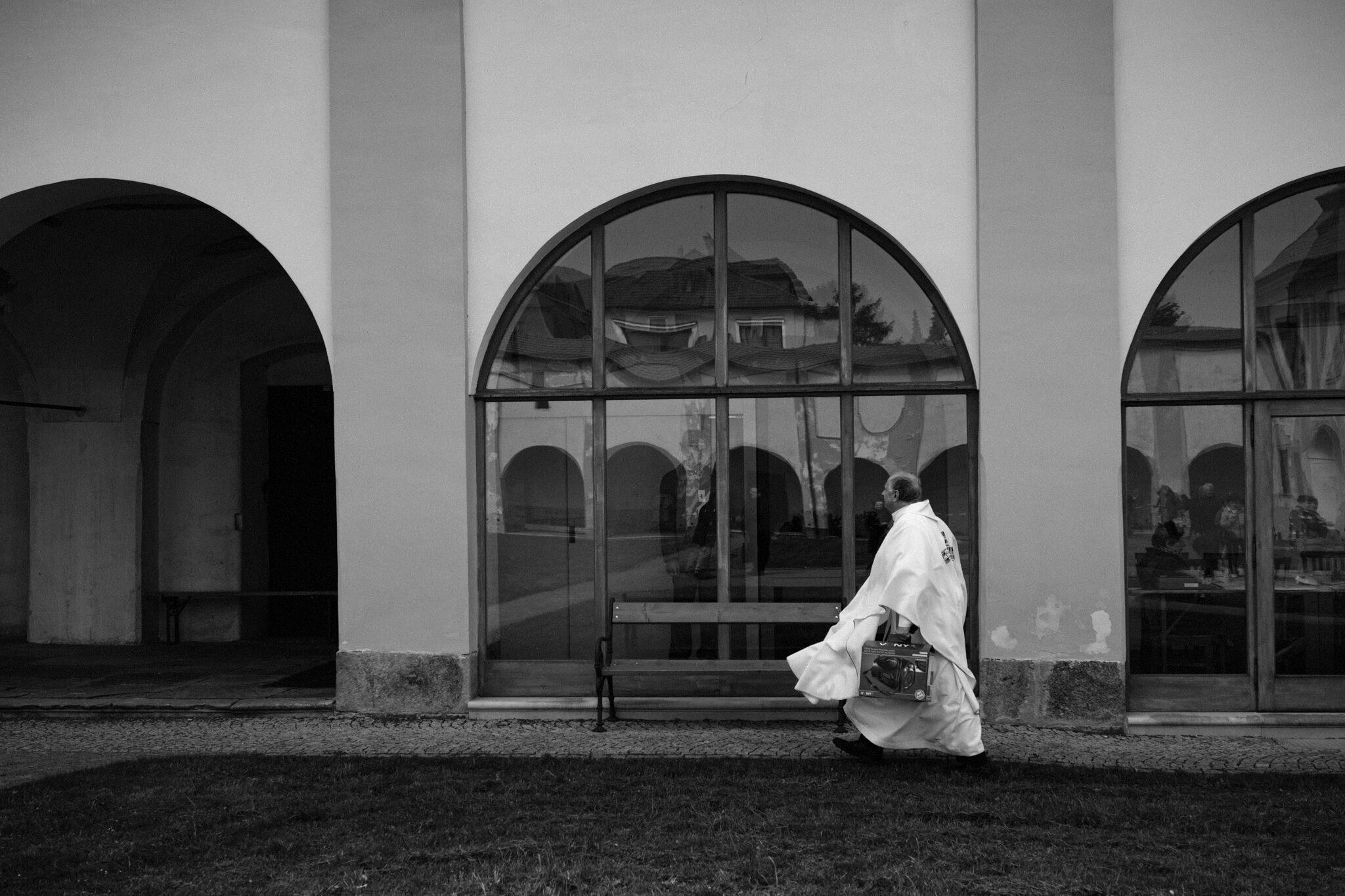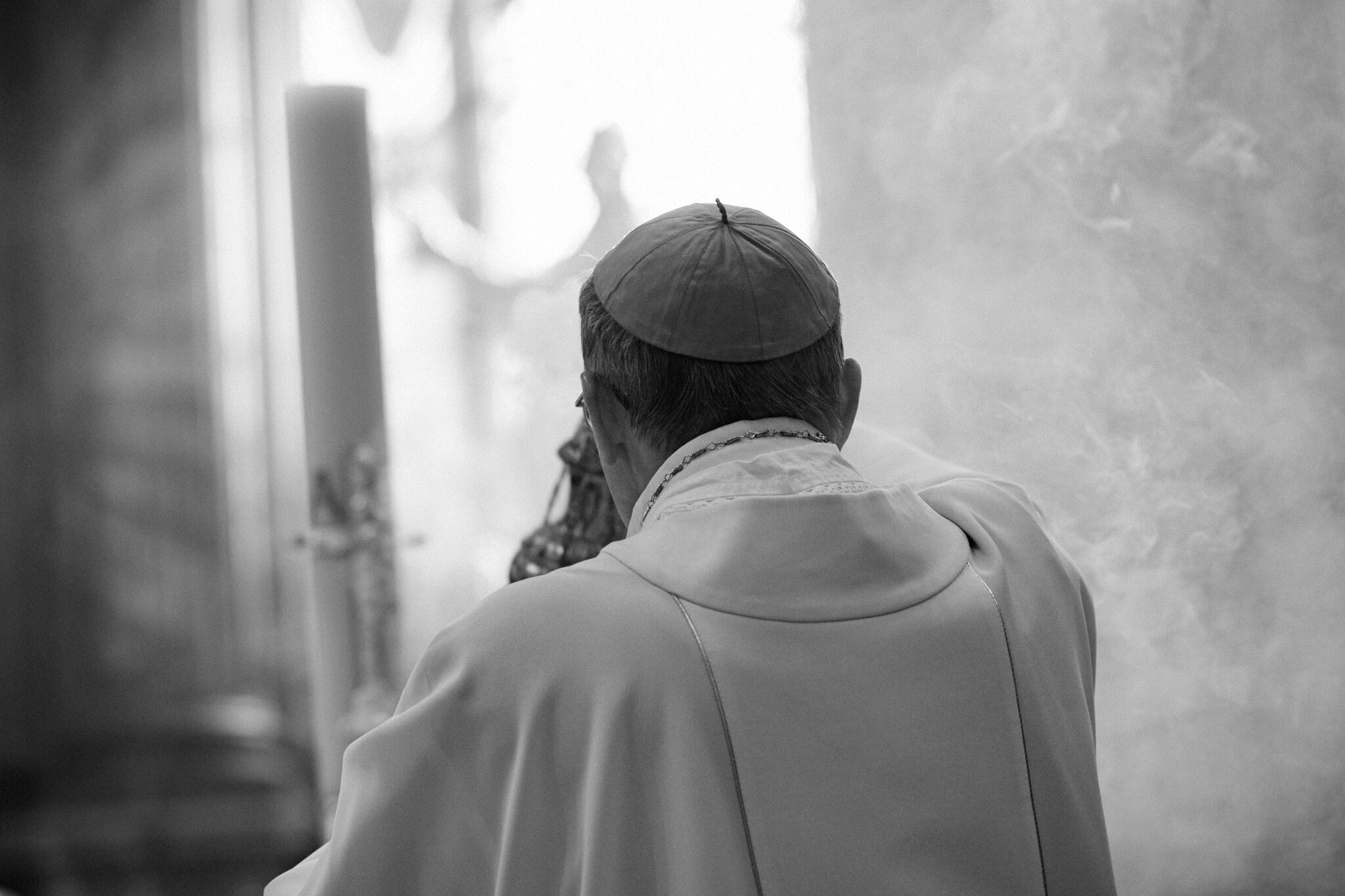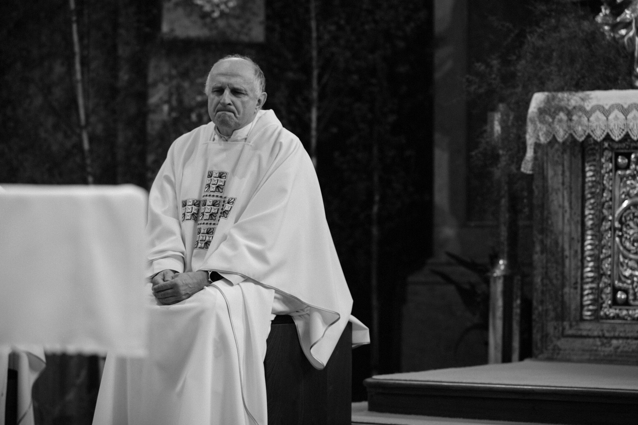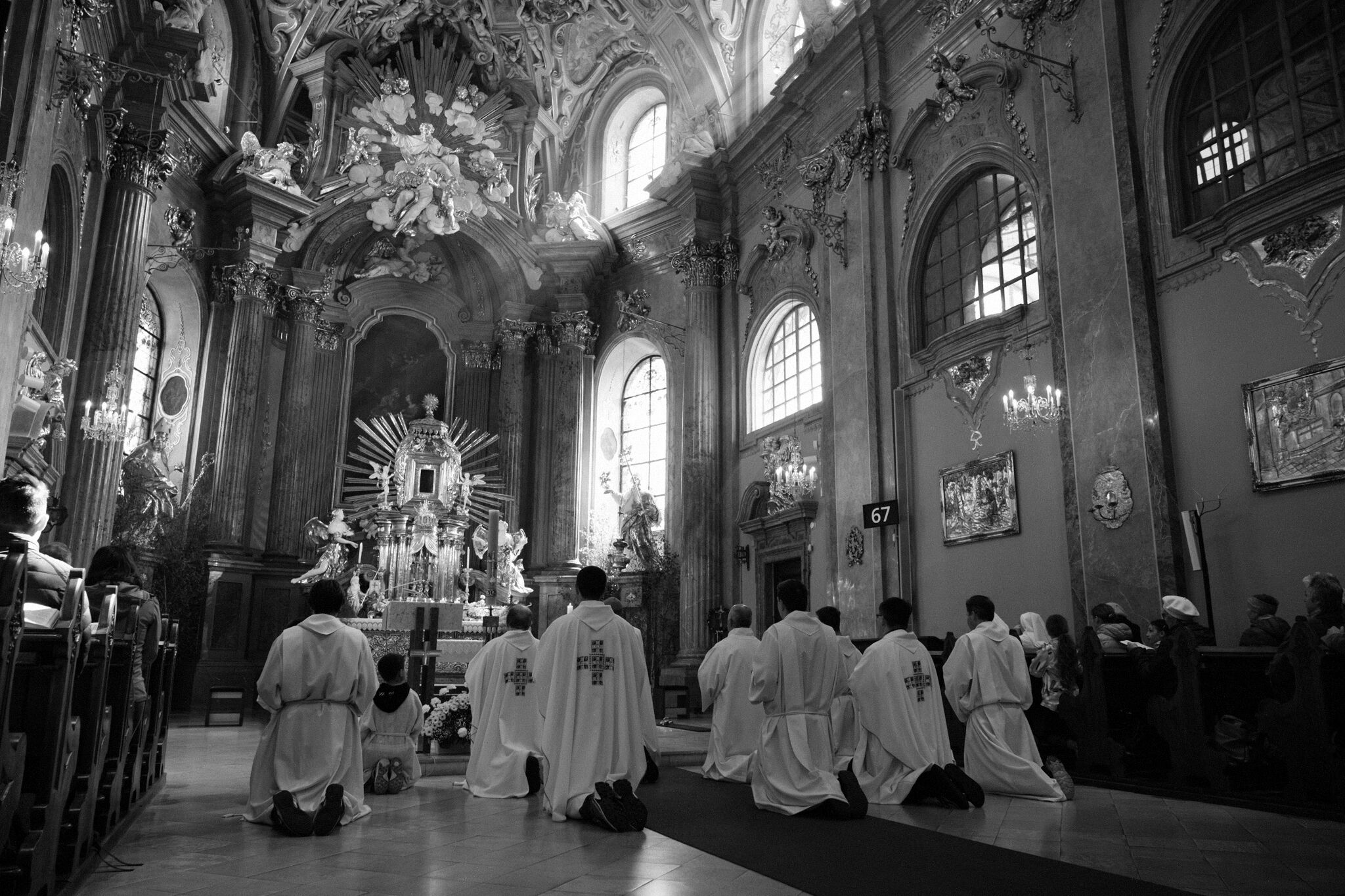 Žehnání obnoveného památníku hrdinům válek v ambitu baziliky na Sv. Kopečku. Památník je dílem sochaře Julia Pelikána.